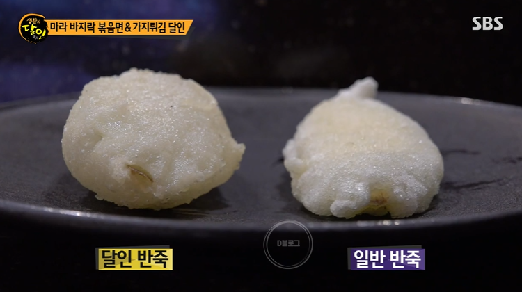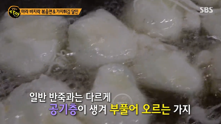 달인은 상식을 뛰어넘는 가지튀김 반죽을 사용해요. 일반적인 감자나 고구마에서 뽑은 전분을 사용하면 5분 안에 튀김이 눅눅해진대요. 대신 이 비법 반죽을 사용하면 시간이 지나도 바삭함을 유지할 수 있대요.