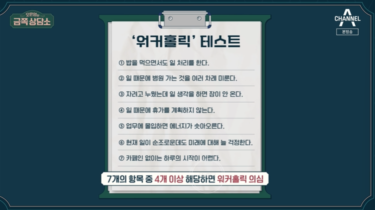 위 워커홀릭 테스트 7개 항목 중 4개 이상이면 워커홀릭을 의심할 수 있대요. 그런데 풍자는 7개 모두 해당한다고 하네요. 워커홀릭의 공통적인 유형이 있대요. 1. 경제력에 대한 강박관념을 가진 사람 2. 완벽 추구, 성취 지향적인 사람 3. 자신의 능력을 과장되게 생각하는 사람 4. 배우자 혹은 가족으로부터 도피하려는 사람