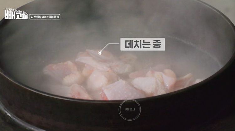 1. 닭고기 끓는 물에 데치기 (기름과 불순물 제거 시 칼로리 다운됨)