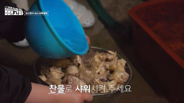 3. 다 익은 닭 건져 찬물 샤워