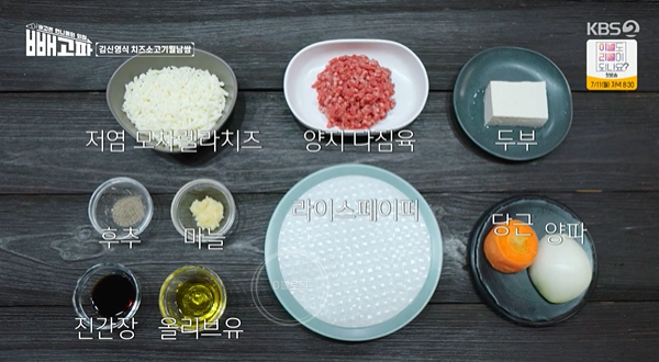 재료 : 저염 모차렐라치즈, 양지 다짐육, 두부, 당근, 양파, 라이스페이퍼, 후추, 마늘, 진간장, 올리브유