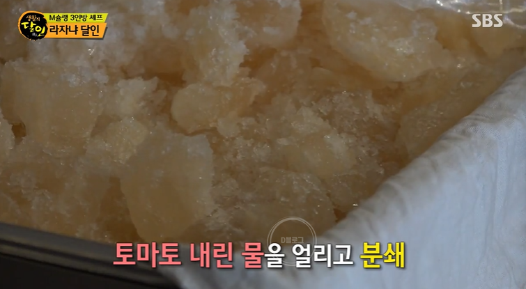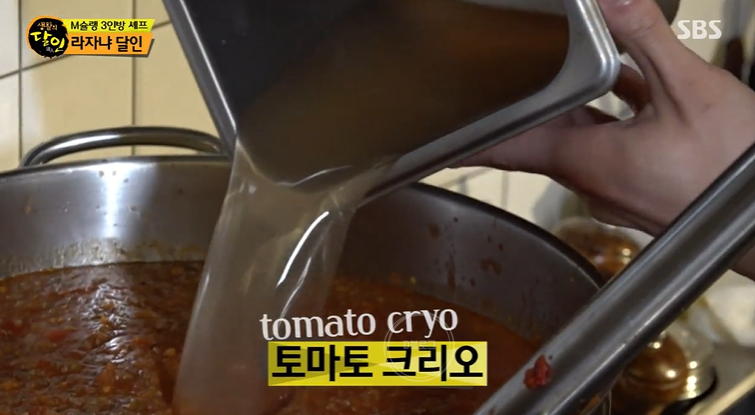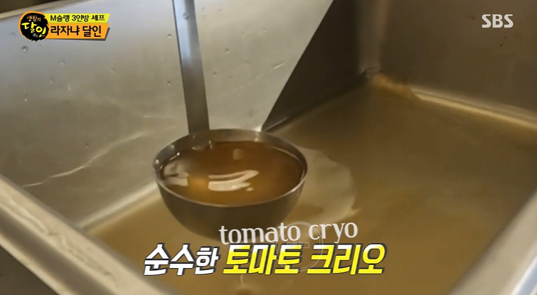 물 등 첨가물이 1도 안 들어간 순수 토마토 그 자체의 얼음 덩어리가 볼로네즈 소스의 시작이에요. 토마토를 갈아서 끓이고 면포에 걸러내요. 그러면 맑은 육수 같은 토마토 원액을 뽑아낼 수 있어요. 이를 '토마토 크리오'라고 한대요.
