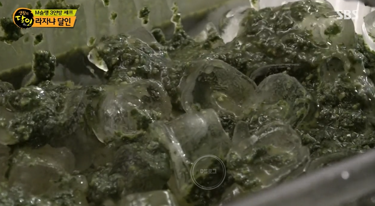 라자냐 면 또한 일반 면과는 달라요. 엑스트라 버진 올리브 오일을 바질에 붓고 생고추냉이도 추가해요. 이를 갈아준 뒤 얼음 위에 뿌려요. 이 상태로 4시간 냉장 보관하면 얼음에 바질 향이 배고, 이후 얼음을 씻어낸 다음 사용한대요.