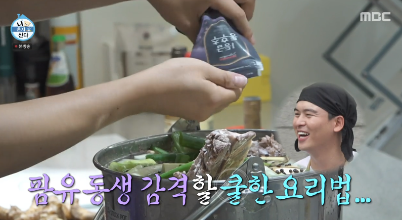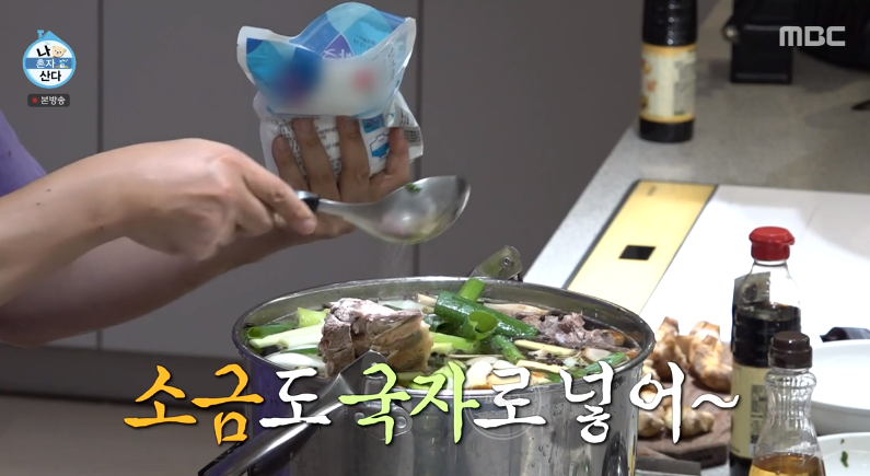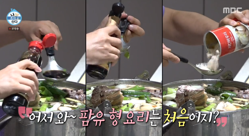 4. 맛술 3큰술, 진간장 3큰술, 소금 1티스푼, 치킨파우더 1큰술, 굴소스 1큰술 넣고 50분 끓이기 (전현무는 막 때려 넣었음)