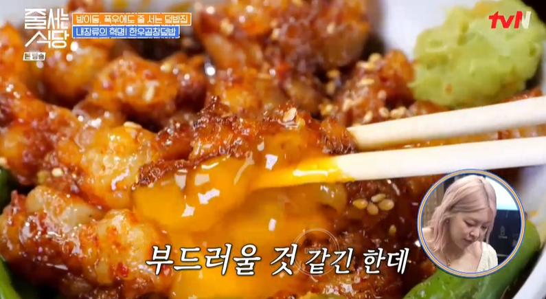 다음으로 등장한 450g 한우곱창덮밥! 햇님은 1kg을 주문했어요! 먹는 방법은 한우곱창이 느끼할 수 있어 고추냉이와 함께 밥에 얹어 먹길 추천한대요. 역시나 이것도 송해나 찐 웃음 나오게 하네요. 전혀 비리지 않고 고소하다고! 신선한 한우곱창을 3시간 동안 푹 삶아 숯불에 구워 만들어져요.