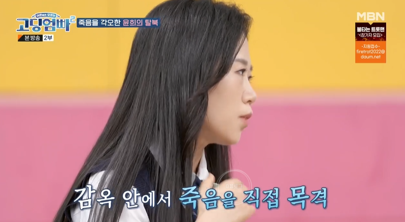 양윤희는 무려 혼자서 북을 탈출했다고 해요. 14살 나이, 무려 4번의 시도 끝에 탈북에 성공, 중국으로 건너갔다고. 3번을 탈출하다 잡혔는데 다시 북송됐고 어린 나이라 훈방 조치됐대요. 하지만 세 번째 잡혔을 때는 6개월 간 감옥 생활을 했대요. 14살에 감옥이라뇨 ㅜㅜ 감옥에 갇힌 양윤희는 영양실조로 죽는 사람을 직접 목격하기도 했대요.