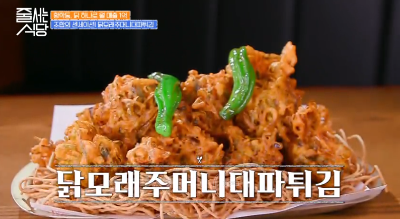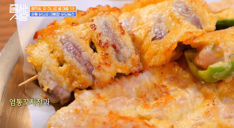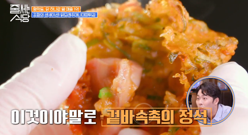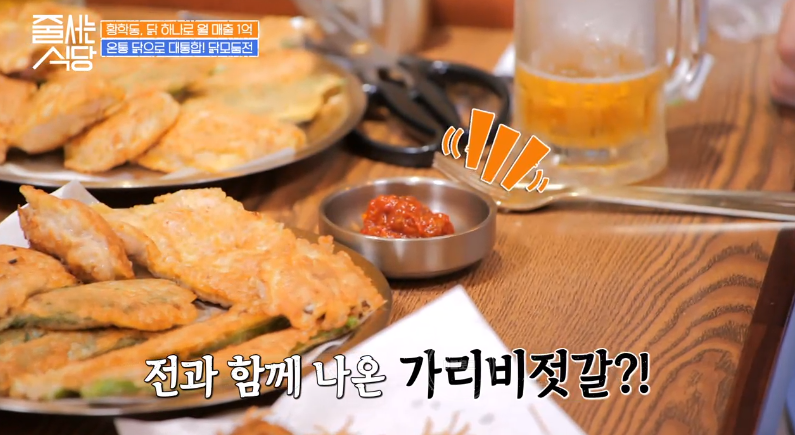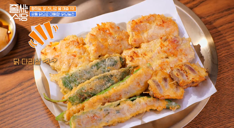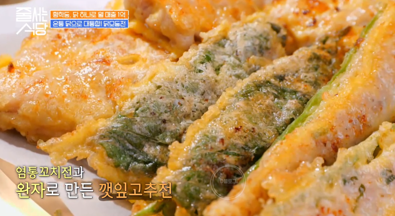 닭 모둠전도 등장! 닭다리살, 닭 목살, 염통꼬치전, 깻잎고추전 등 오로지 닭으로만 이루어진 모둠전이에요. 간장이 아닌 가리비젓갈과 함께 먹는 것이 특징! 김해준, 박나래, 햇님 모두 맛에 반했네요!