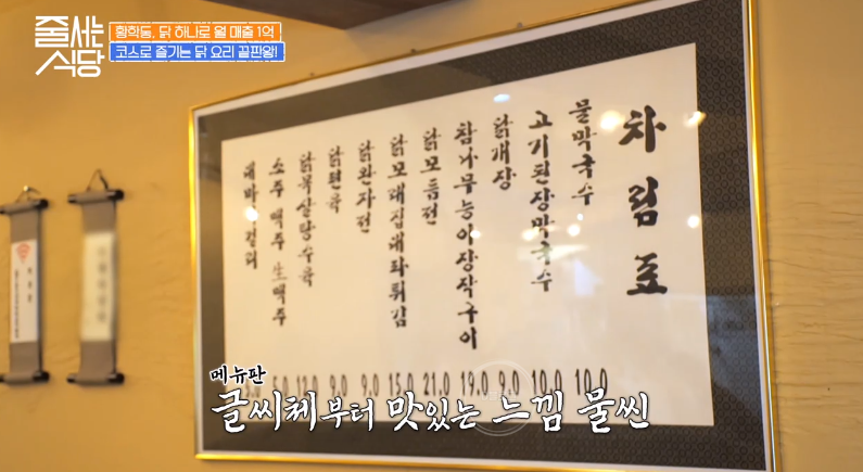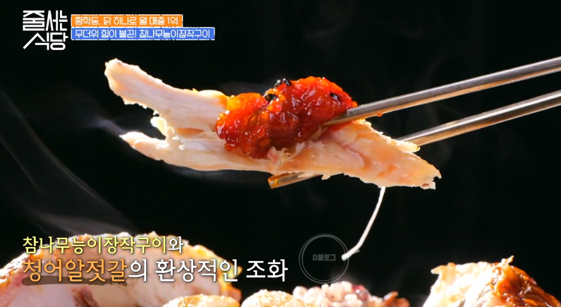 청어알젓갈을 닭 위에 얹어 먹는 게 특이하네요. 고기가 입 안에서 녹듯이 부드럽대요. 닭껍질은 바삭 그 자체! 밥에도 건강한 재료들이 많이 들어가서 어르신들도 좋아하겠어요.