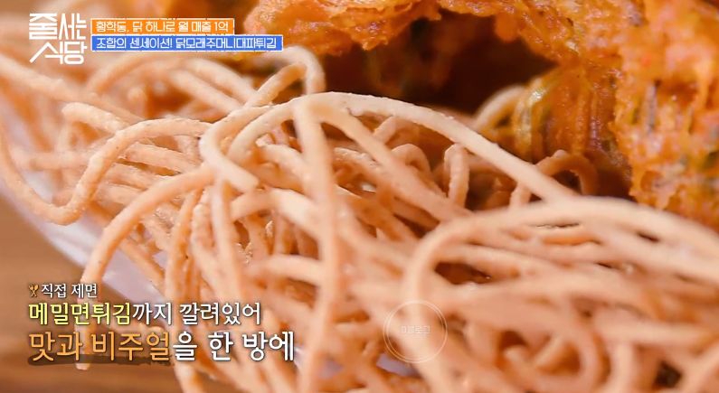두 번째 메뉴는 닭모래주머니대파튀김! 밑에는 바구니인 줄 알았는데 메밀면튀김이었어요. 닭 모래주머니 위에 송송 썬 대파를 가득 올리고 양념에 버무린 뒤 튀겨내요. 대파로 잡내가 완벽하게 제거되네요.