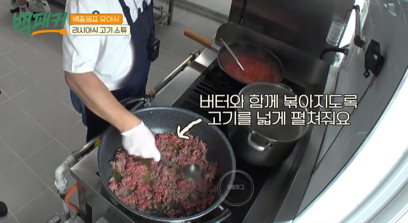 (버터와 함께 볶아지도록 고기 넓게 펴주기)