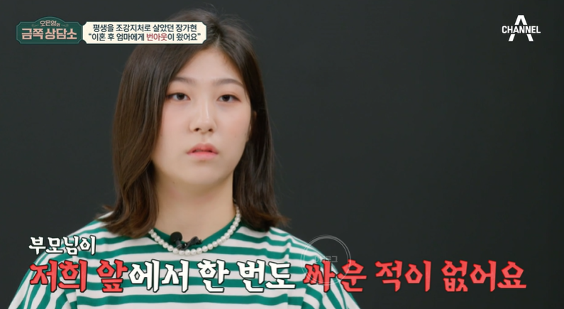 장가현은 딸 앞에서 남편과 한번도 싸운 적이 없다고 해요. 하지만 서로 멀어지고 있다는 걸 느끼고 있었다고. 엄마 장가현은 세끼 밥을 다 차려주고 무릎 꿇고 직접 바닥을 닦던 열심히 살던 사람이었대요. 하지만 어느 날부터 번아웃이 왔고 살림을 모두 놓아버렸대요. 악플에도 아무렇지 않아 하는데 사실, 계속 병원에 다니고 잠도 못 자고 속으로는 앓고 있다는 게 느껴진대요. 딸은 그런 엄마가 답답하대요.