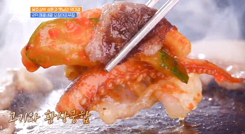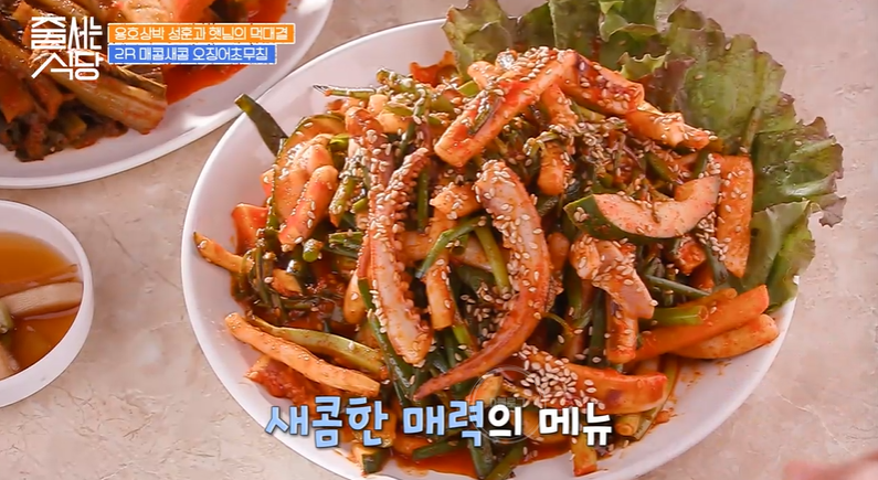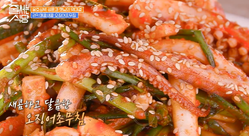 두 번째 메뉴는 새콤한 맛이 매력적인 오징어초무침! 새콤달콤해서 고기로 느끼해진 입맛을 다시 살려준대요. 환상의 궁합이네요.