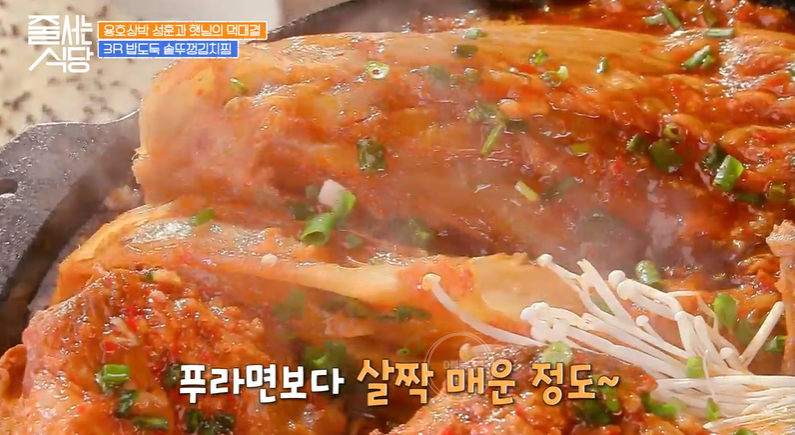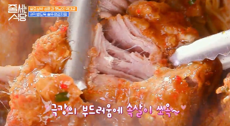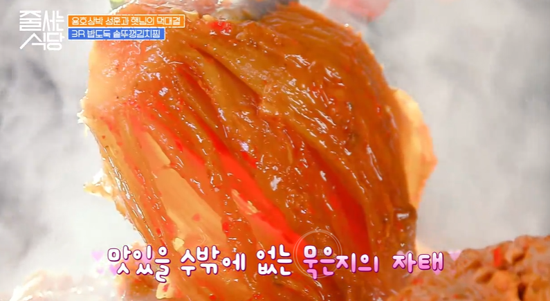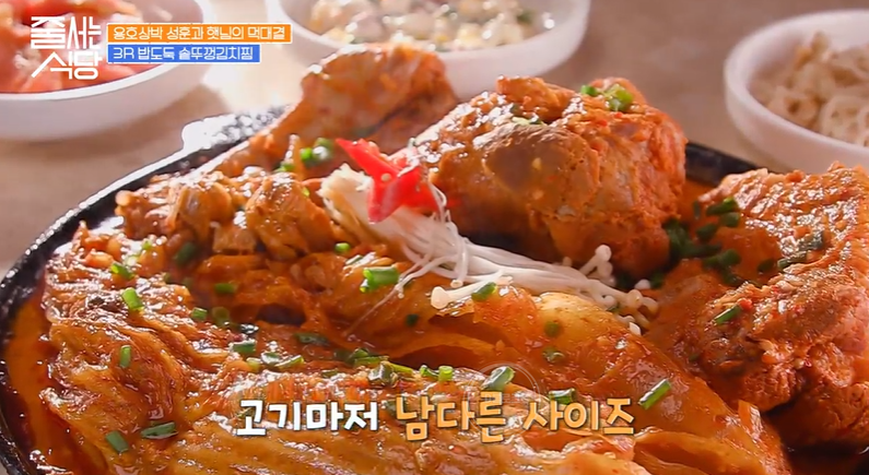 메인 메뉴 솥뚜껑 김치찜 등장! 비주얼이 미쳤더라고요. 돼지고기 등갈비와 앞다리살이 들어갔어요. 너무 부드러워서 그냥 손만대도 쫙쫙 뜯어지더라고요. 두부도 같이 나와서 담백하게 두부김치로도 즐길 수 있어요. 김치도 엄청 부드럽대요. 성훈과 햇님은 좀 맵다고 하는데 박나래는 신라면보다 살짝 매운 정도래요.