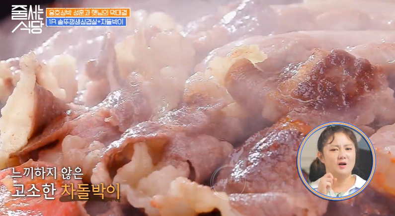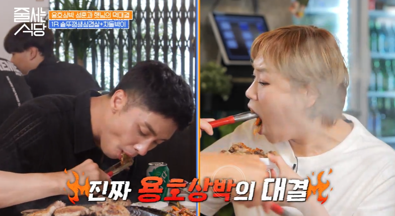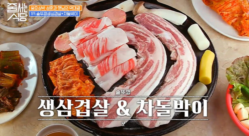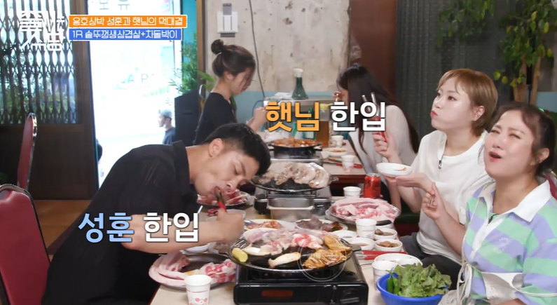 '줄 서는 식당' 성훈이 햇님과 먹방 대결을 펼쳤어요. 첫 번째 식당은 솥뚜껑 위에 삼겹살+차돌박이+김치를 구워 먹는 고깃집이었는데요. 불판 하나씩 가지고 미친 듯이 먹어대는 두 사람ㅋㅋㅋㅋ 투샷 예술이더라고요. 중간에서 불쌍한 박나래ㅋㅋㅋㅋㅋ