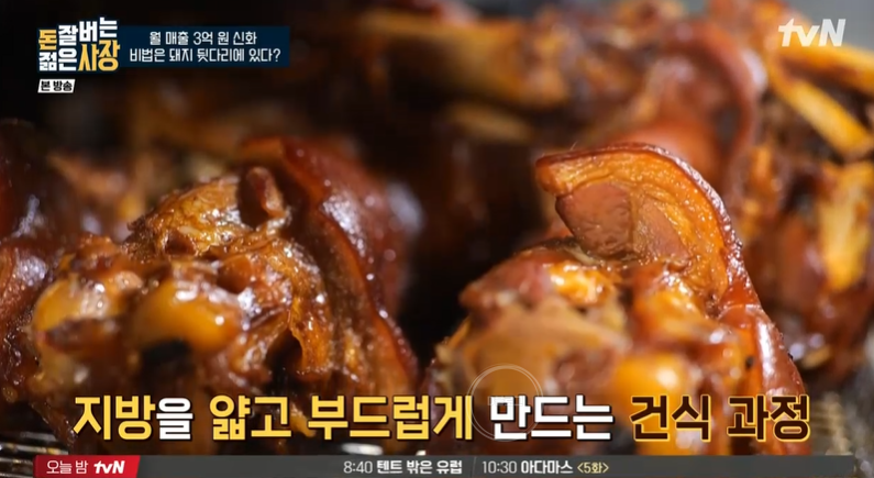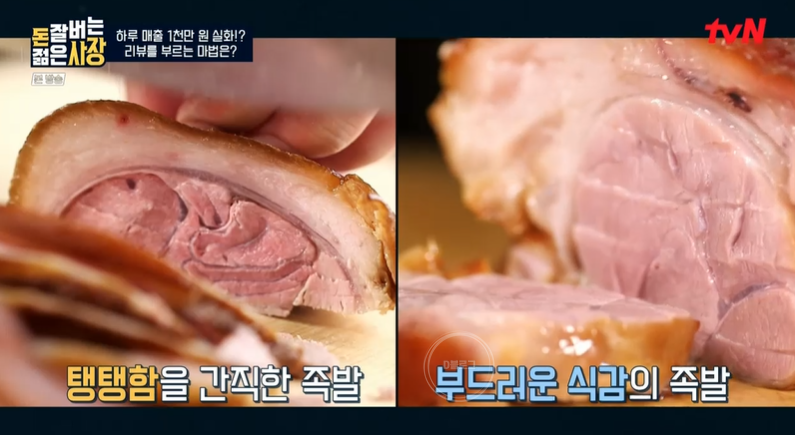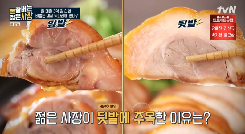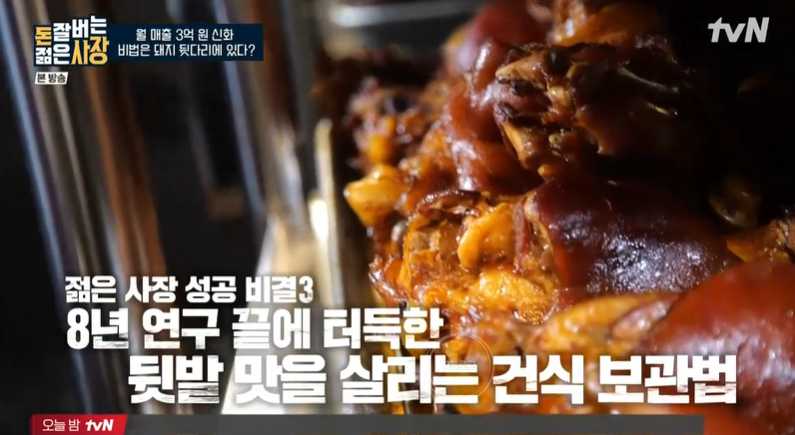 젊은 사장은 강남 진출 3년 만에 50여 개의 가맹점으로 확장했어요. 뜨끈한 족발을 실온에서 보관하는 게 신기한데, 앞발보다 뒷발이 지방층이 두꺼워서 지방을 얇고 부드럽게 만드는 건식 과정을 거친대요. 이것이 젊은 사장의 성공 비결 세번째.