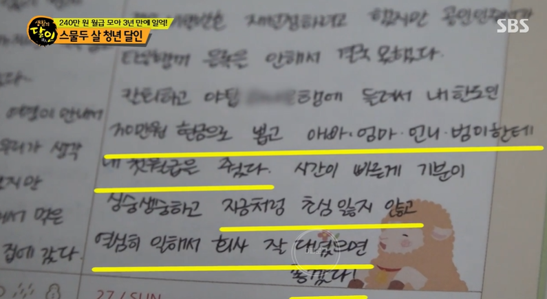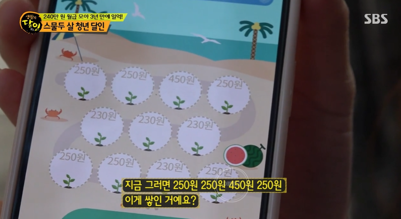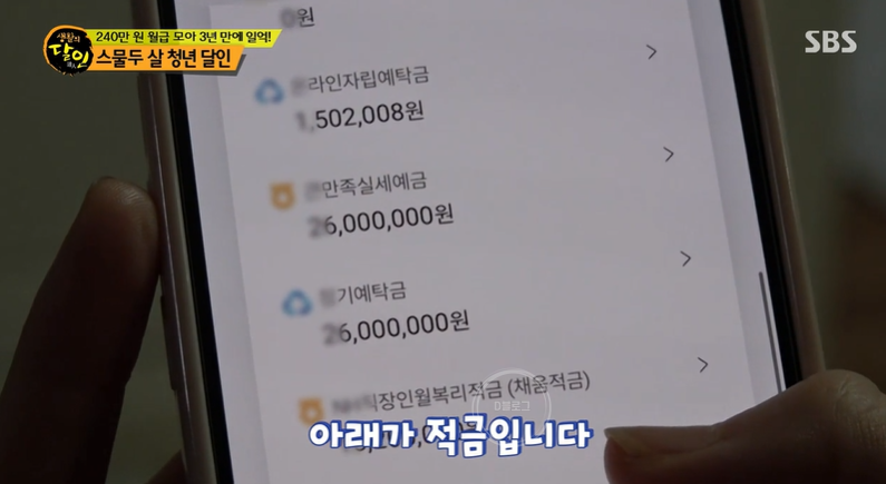 달인은 내 집 마련을 할 때까지 부모님과 함께 살 예정이래요. 회사 월급은 세후 235만원이고, 주말 아르바이트로 42만 원을 받고 있대요. 한 달 총수입은 277만 원 정도. 이중 무려 230만 원을 적금으로 넣고 있대요.