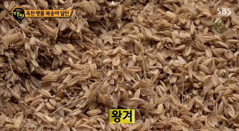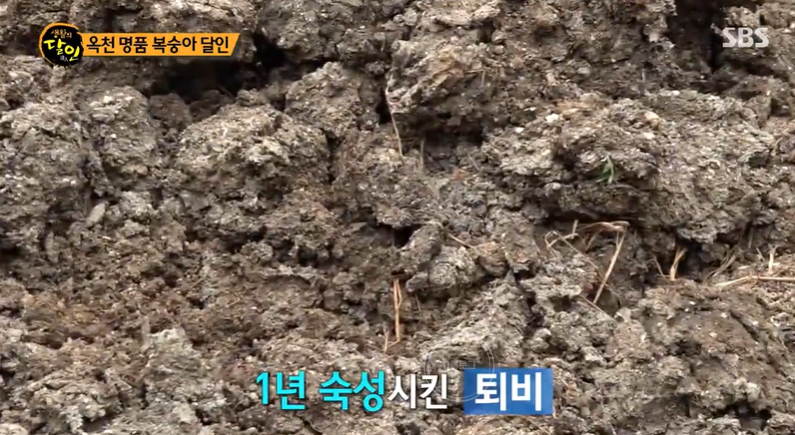 명품 복숭아 맛의 비결은 흙 색깔에 있어요. 옛날 방식으로 거름을 많이 주고, 화학 비료를 덜 쓰는 방법이래요. 그래서 다른 복숭아보다 크기는 작을 수 있지만, 당도 면에서는 달인의 복숭아가 우세하대요. 1년 숙성시킨 천연 퇴비를 사용하는데, 축사에서 나온 우변이래요. 100% 우변에 각종 미네랄이 풍부한 천연 재료 왕겨를 더한 것이 비법.