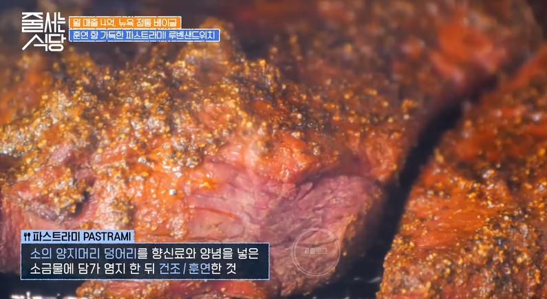 훈연 향이 가득한 파스트라미! 루벤샌드위치도 등장했어요. 파스트라미는 소의 양지머리 덩어리를 향신료와 양념을 넣은 소금물에 담가 염지한 뒤 건조, 훈연한 것을 말해요. 이국적인 맛으로 숙성된 햄의 향이 그대로 느껴진대요.
