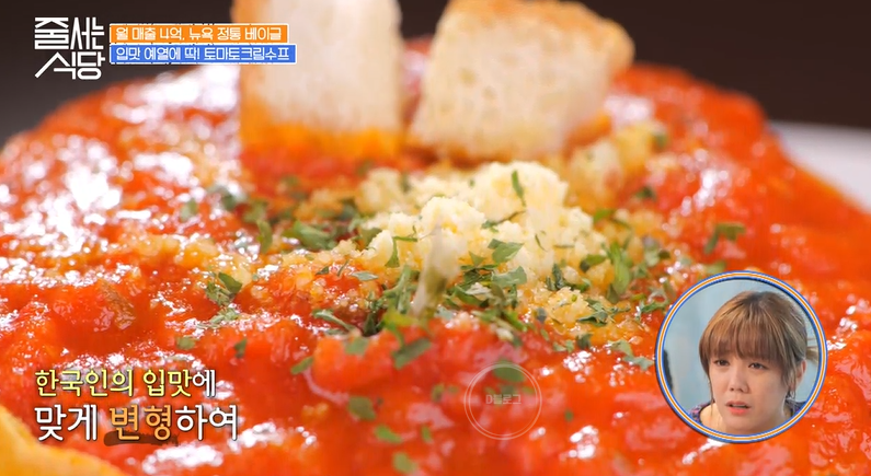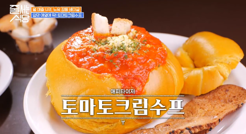 첫 메뉴로 토마토크림수프가 등장했어요. 고소한 베이글과 토마토소스의 신선한 조합이에요. 한국인 입맛에 맞게 변형해 신맛보다는 고소하면서도 프레시 하대요.