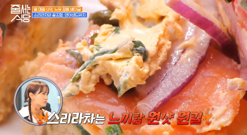 다음은 겉모습부터 화려한 연어샌드위치. 청양고추베이글에 스리라차 소스가 듬뿍 들어갔어요. 여기에 슬라이스 연어 듬뿍 올리기! 스리라차가 연어의 느끼함을 단번에 잡아준대요.