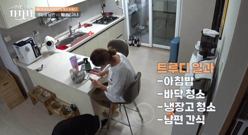 이대은이 게임하는 동안 트루디는 아침밥, 바닥청소, 냉장고 청소에 남편 간식까지 준비해주네요. 또한 벽지 도배, 리모델링 업체 선정, 이삿짐 업체 선정, 에어컨 이전 설치, 수도, 가스 등 이삿짐 준비도 모두 트루디 몫이네요. 해야 할 일들을 이대은에게 말하지만, 이대은은 귀에 피난다고 막아버리는..