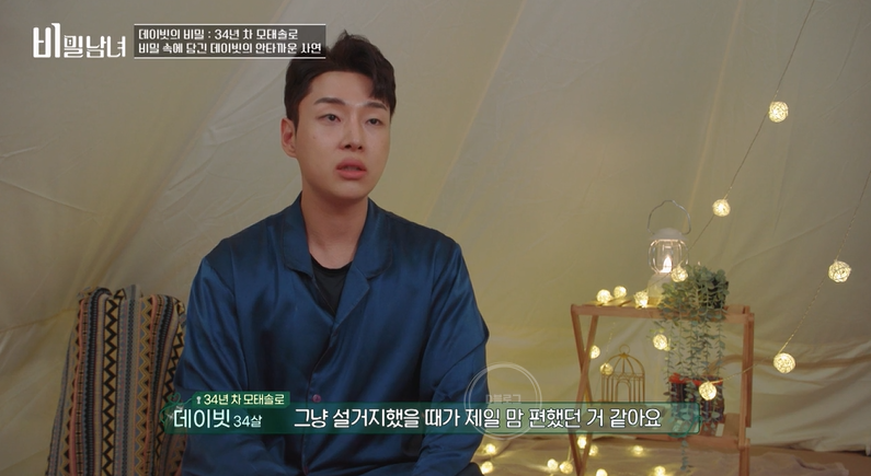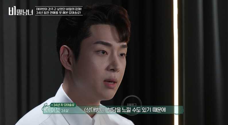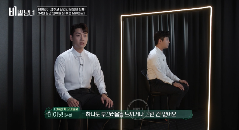 "34년간 연애를 못 해 본 모태솔로입니다. 이런 거에 대해서 저는 하나도 부끄러움을 느끼거나 그런 건 없어요. 그런데 상대방이 부담을 느낄 수도 있기 때문에. '너와의 첫 데이트 너의 첫 연인, 그걸 나쁜 추억으로 만들고 싶지 않아' 그런 식으로 부담을 줄 수 있기 때문에 그래서 비밀로 해 달라고 말씀드렸던 겁니다. 주변 반응은 '믿을 수 없다 네가 무슨 모태솔로냐 34년 동안? 또 캐릭터 신선하게 잡았네' 이런 식으로 얘기하는 분들도 계시더라고요"