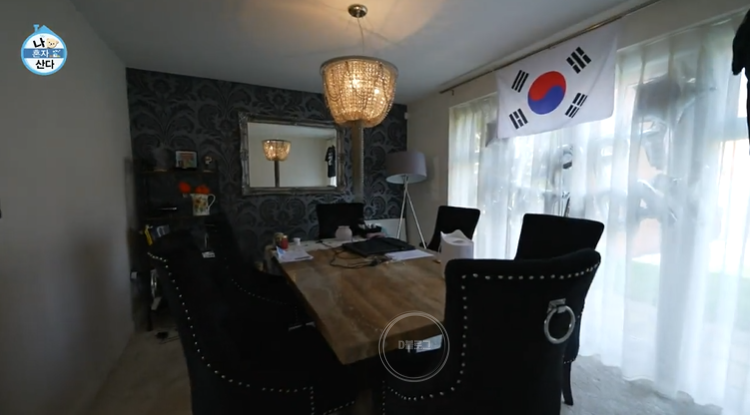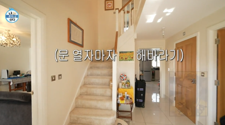황희찬 집은 3층 단독주택이에요. 일단 문을 열자마자 해바라기 액자부터 컵까지 해바라기 웰컴존이 등장하네요ㅋㅋ 1층에는 주방과 다이닝 공간이 있고 서재 같은 공간을 지나면 거실이 나오는 구조예요.
