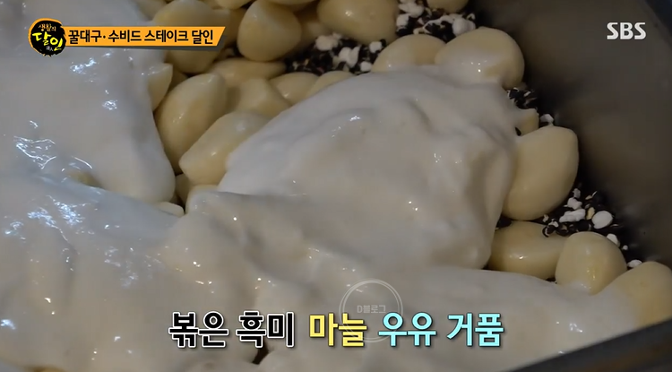 볶은 흑미 위에는 마늘, 우유 거품을 올려 공기를 완벽하게 차단해요. 그리고 냉장고에 4시간 굳히기. 우유 거품은 마늘의 알싸한 맛을 중화시키고 특유의 풍미를 살려준대요.