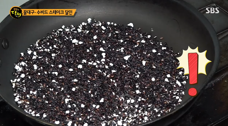 꿀대구의 시작은 팬에 흑미를 볶는 것부터 시작돼요. 얼마간의 시간이 지나면 흑미가 톡톡 터지면서 마치 팝콘처럼 하얀 꽃이 펴요. 낱알 안의 수분이 팽창하면서 팝콘처럼 튀는 거래요.