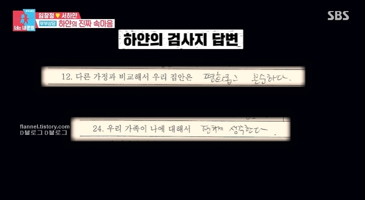 반면 서하얀은 가장 행복했던 장면으로 엄마, 아빠와 마트에서 장을 보는 모습을 기억했네요. 그리고 한 명씩 상담이 이뤄졌어요. 서하얀은 검사지에서는 결혼 만족도가 높게 나타났대요. 하지만 힘든 부분을 물으니, 임창정에게 배려있게 말했다 생각하는데 남편이 언성을 높이거나 하면 눈물이 나온다거나 하려던 말도 쏙 들어간대요.
