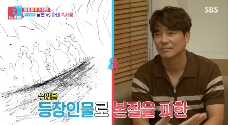 임창정의 그림에서는 나를 드러내고 싶지 않다는 방어적 의도가 담겨 있대요. 그 방법은 수많은 등장인물로 초점을 분산시키는 것. 불리할 때 초점을 흐려서 방어를 하는 기질이 있다는 거예요. 근데 이게 부인 입장에서는 소통 차단의 시그널로 느껴질 수 있다고. 서하얀이 화를 내는데 용기낼 수 있는 방법은 남편의 경청이래요. 그 경청은 상대방이 느껴야 한대요. 진심으로 듣고 있지 않다고 느끼면 서하얀은 감정을 숨길 것이고, 그렇게 되면 감정이 말라 버릴 수도 있대요. 때문에 임창정은 보호하는 역할이 꼭 필요하대요. 사소한 대화부터 집중과 경청이 필요하다고.