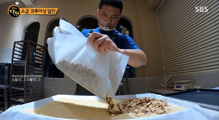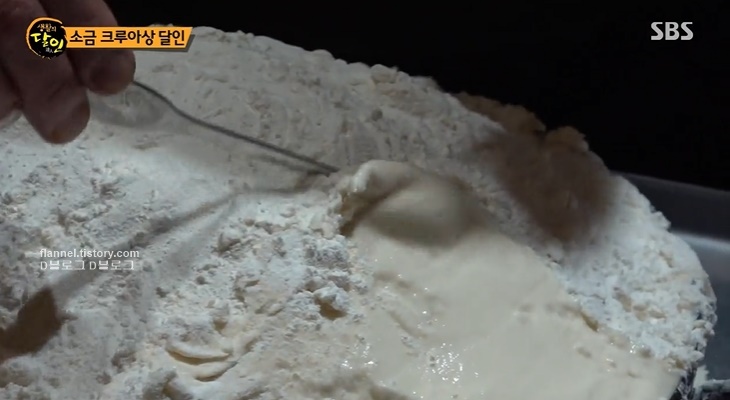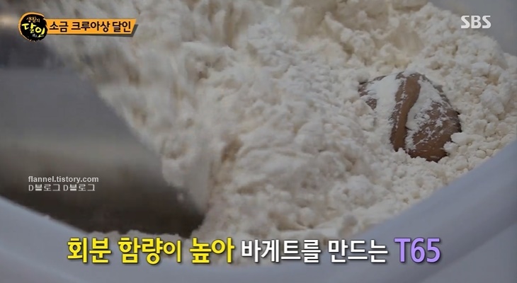 크루와상 또한 쉽게 만들어지지 않아요. 달인은 빵 종류에 따라 10가지 밀가루를 섞어 쓴다고 하네요. 크루아상은 'T45'를 이용해요. 안에 호두가 들어있더라고요. 호두는 밀가루 습도 조절에 도움을 준대요.