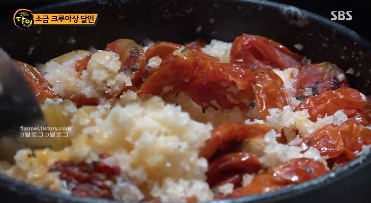 달인은 단짠 맛을 내는 소금을 직접 제조해 쓰고 있어요. 산미가 높은 풋사과를 소금과 잘 어우러지게 섞는 건데요. 이렇게 하면 사과즙이 소금에 베어 들면서 자연스럽게 짠맛은 중화되고 향은 더해진대요. 그리고 작은 그릇에 덜어 담고 위에 오일에 절인 반건조 대추 토마토를 올려요. 그리고 뚜껑 씌우듯이 반죽을 덮고 오븐에 쪄요.