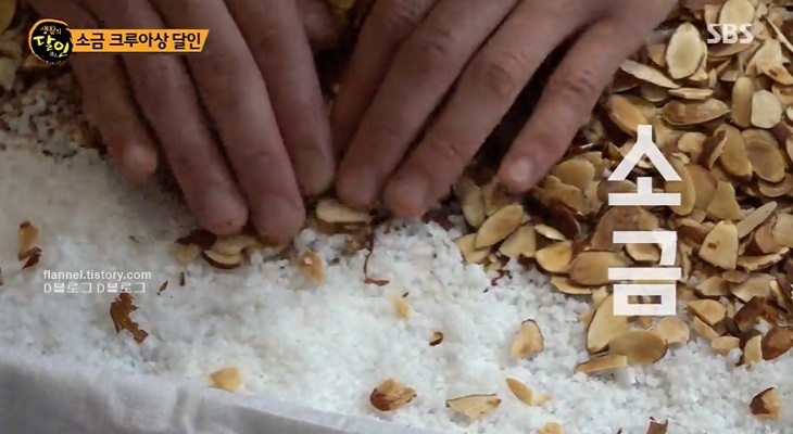 그리고 소금 위에 편으로 자른 아몬드를 투하! 이후 무거운 돌로 눌러줘요. 그렇게 하루 지나면 달인표 소금 완성!