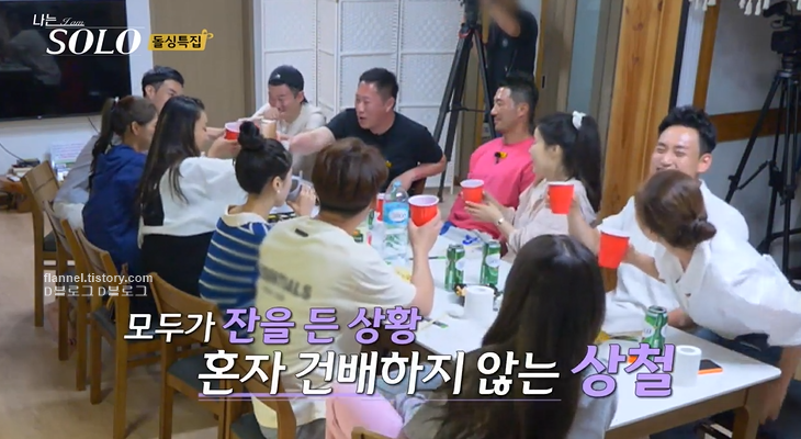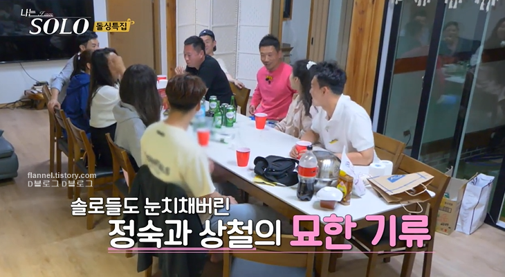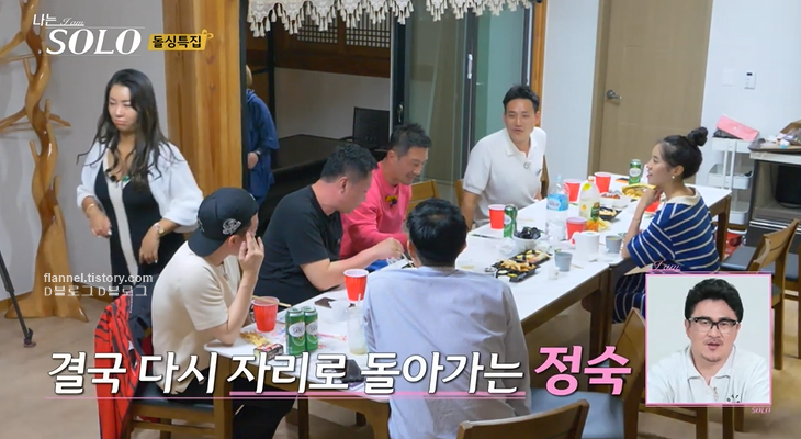 솔로들이 모두 숙소에 들어오자 술자리가 시작됨. 그리고 정숙과 상철의 묘한 기류를 모두 눈치챔. 정숙은 언니 입장에서 모두들 잘됐으면 좋겠다며 훈화 말씀을 시작함. 고민 있음 얘기하고, 돈 필요하면 얘기하라는 말도 덧붙임. 주도해서 파이팅을 외치는 등 언니놀이?도 함. 하지만 혼자 잔 들지 않고 짠 안 하는 상철. 결국 정숙이 이야기하자며 옆으로 가지만 이마저도 돌려보내는 상철.