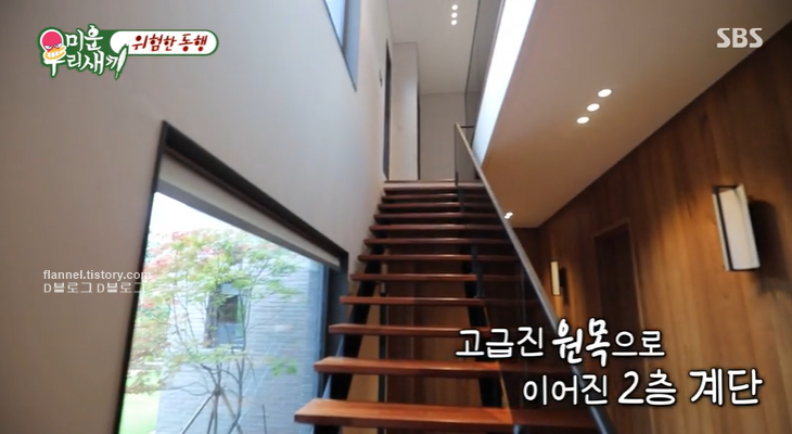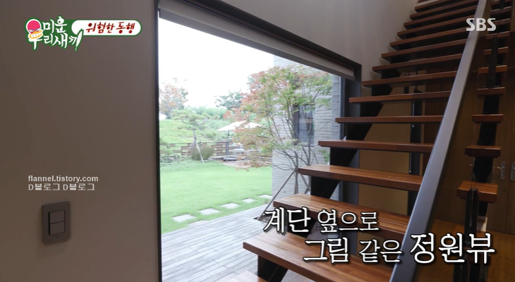 2층으로 이어지는 고급 원목 계단. 계단 옆으로 그림 같은 정원 뷰가 펼쳐지네요. 원목 나무벽 또한 비싼 금액이라고.
