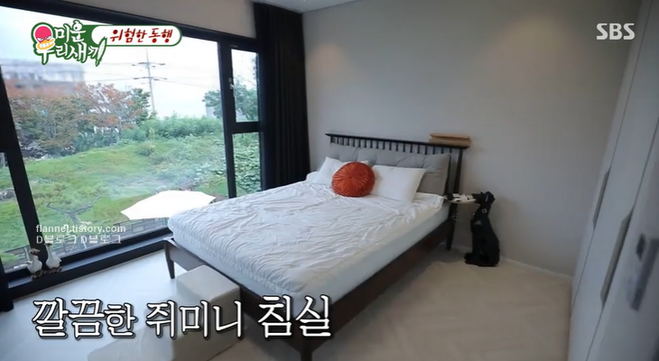 김지민 침실 또한 모던하면서도 창 밖 푸릇푸릇 뷰가 이어지네요. 푸른 정원 너머로 바다 뷰가 보이네요.