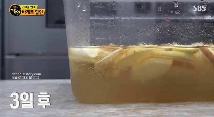 맨 밑 사과에 꿀이 떨어지면 뜨거운 물을 부어 3일 간 발효시켜요. 이렇게 하면 모(母) 반죽에 발효력이 좋아지고 밀가루 본연의 맛이 더 강해 진대요.
