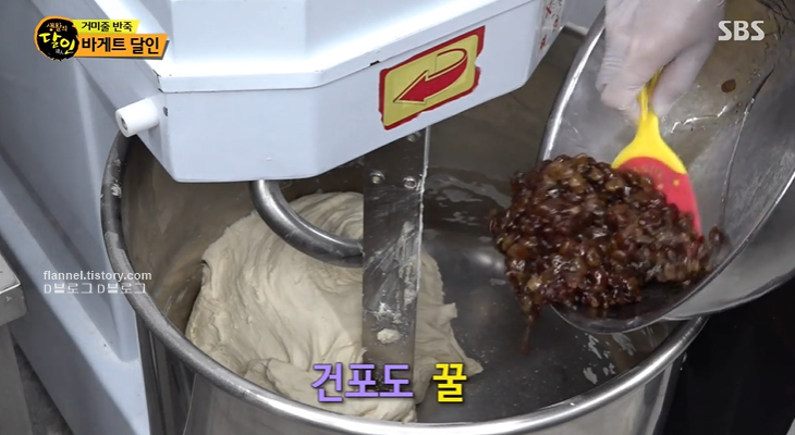 그리고 본격적인 미엘 바게트 만들기! 모 반죽을 밀가루에 넣고 섞어줘요. 그리고 꿀에 끓인 건포도 추가! 이렇게 하면 바게트 반죽이 완성돼요. 그리고 달인의 손 끝에서 만들어지는 바게트!