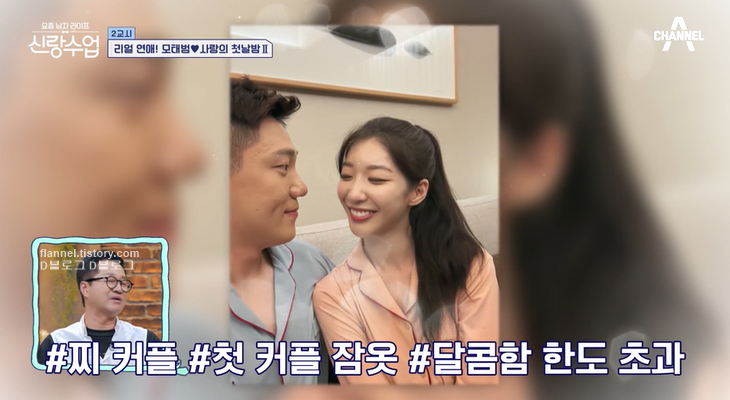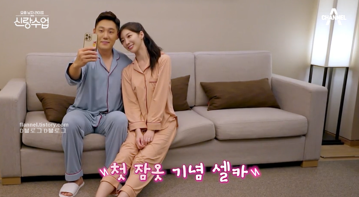 사랑이가 준비한 커플 잠옷도 입은 두 사람. 신혼여행 온 분위기ㅋㅋㅋㅋㅋ