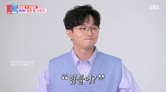 그러다 일적으로 힘든 일이 있었고 집에서 우울해하고 있던 때 박성광에게 전화를 했대요. 그때 박성광이 "힘들어? 힘드면 나한테 기대"라고 했대요. 그때 마음이 열리면서 연애를 시작했다고!