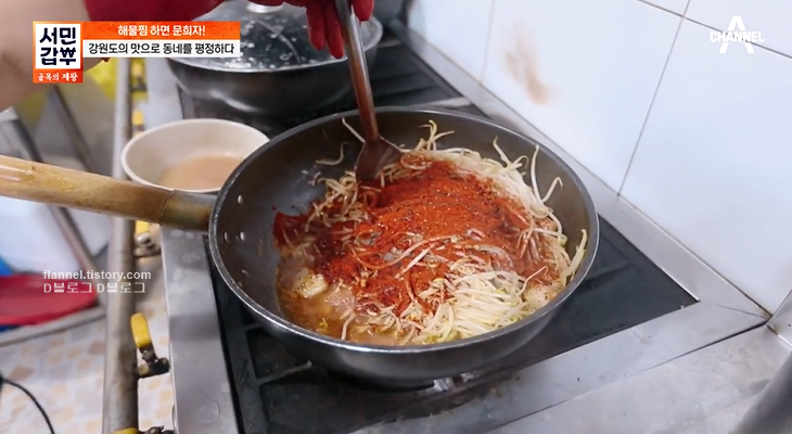 동해에서 잡은 싱싱한 조개, 미더덕, 가리비, 백골뱅이, 홍게, 문어 등 푸짐한 해산물이 들어가 보기만해도 침샘을 자극해요. 백골뱅이 껍질이 약해서 해산물을 모두 덜어내고 콩나물에만 따로 양념을 해서 만든대요.