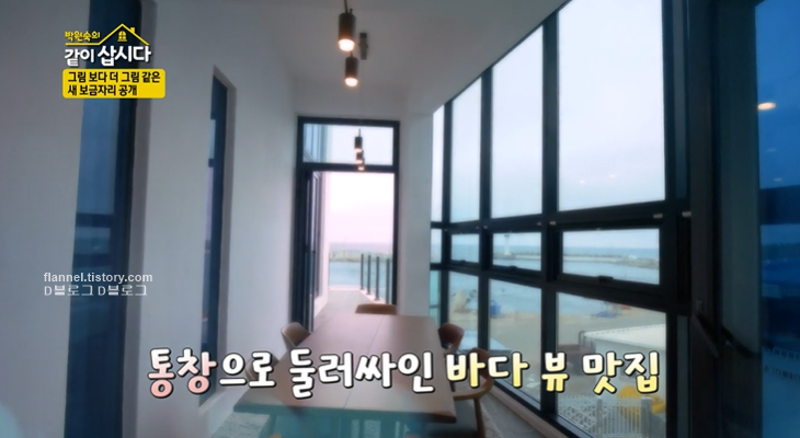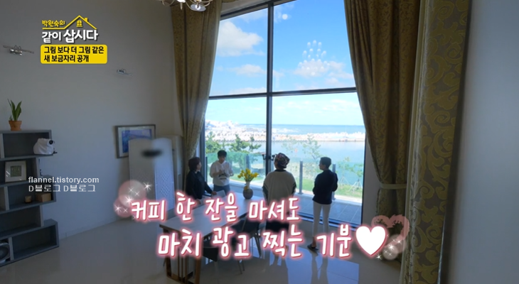 '같이삽시다 시즌3' 포항 촬영지가 공개됐어요. 통창으로 한눈에 바다가 내려다 보이는 아찔한 전망의 새 보금자리인데요. 박원숙, 혜은이가 새 집을 찾아가는데 고래 벽화가 여기저기 많더라고요. 다무포라는 글씨도 보이고요.