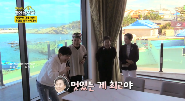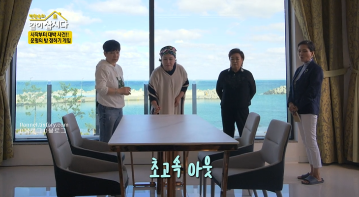병뚜껑 날리기 게임 결과. 혜은이가 승리하면서 방 배치를 했어요. 1층은 큰언니 박원숙에게, 혼자 자기 무서워하는 혜은이와 안문숙이 트윈 방, 나머지 더블침대는 안소영이 차지했네요.