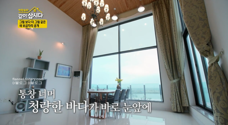 새집은 바다 바로 코앞에 있어요! 천장이 정말 높네요. 화이트&원목으로 인테리어 된 듯!