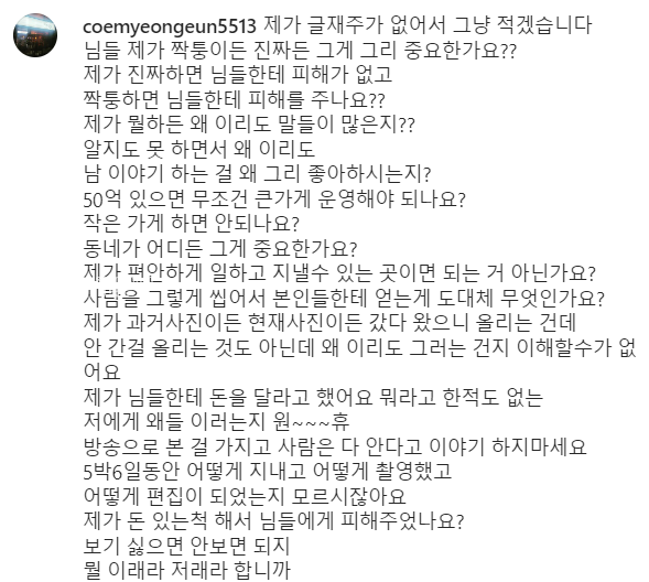 정숙 님은 최근 짝퉁 착용 논란에 대해 분노를 표하기도 했어요. 그리고 인스타 디엠으로 돈을 빌려 달라는 요구가 정말 많이 온대요. 심지어 가게까지 찾아오고, 술집에서는 팬이라며 자신들의 술값을 안 내고 가서 대신 낸 경우도 있다고 하네요. 이런 것 때문에 스트레스가 정말 많으신 듯 ㅜㅜ 이외에도 출연진들이 방송 소감과 오해들에 대해 인스타를 통해 해명했어요. 각자의 인스타는 아래 링크로!
