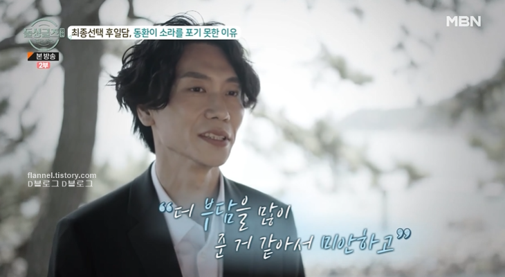 "내가 선택 못 받았을 때 후련하면서도 아쉬웠던 게 선택 안 한 이유가 '이 사람 별로일 것 같아요' 내지는 '별로 이성적 호감이 안 생겨요' 이거였으면 아무런 미련이 없을 것 같은데 네가 마지막에 그랬잖아. '내 상황 때문에..' 이유가 그거니까 아쉽잖아"