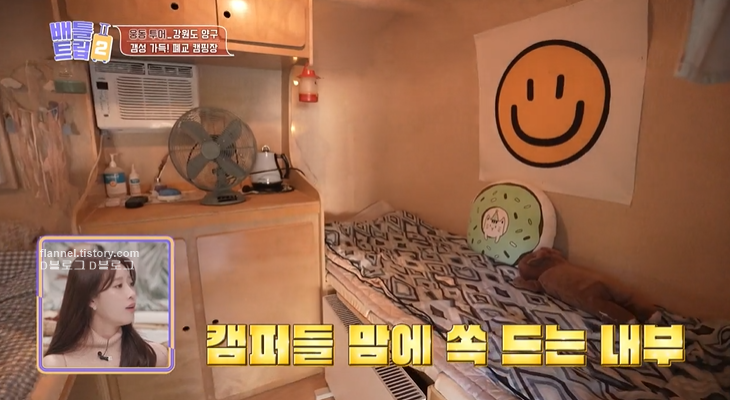 그리고 운동장 한쪽에 있는 갬성 카라반 너무 예쁨!! 내부를 보면 침대가 양쪽에 하나씩 있어요. 침대 하나는 더블이라 연인끼리, 친구끼리 가도 너무 좋을 듯!