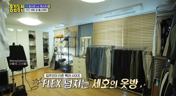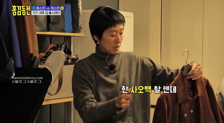 옷방이 정말 크더라고요. 원래 2개 방인데 집주인이 하나로 터줬대요. 여기저기 비싼 브랜드 제품들이 가득하네요. 재킷 하나만 4~5백만 원이라고? 가방 하나는 무려 차 한 대 값!