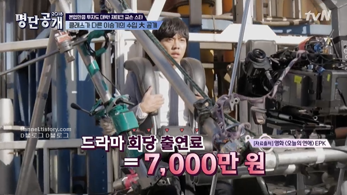 이승기는 노래, 예능감, 연기력까지 고루 갖춘 멀티 연예인 중 한 명이에요. 지난 2004년 발표한 노래 '내 여자라니까'로 데뷔하자마자 단숨에 인기몰이한 이승기. 이후 드라마, 예능에 출연하며 현재까지 큰 인기를 끌고 있어요. 그 결과 드라마 회당 출연료는 7천만 원, 광고 개런티는 7억 원에 달한다고 하는데요. 물론 이 방송 자료는 4년 전이에요! 지금은 더 올랐을 수도, 더 떨어졌을 수도 있어요.